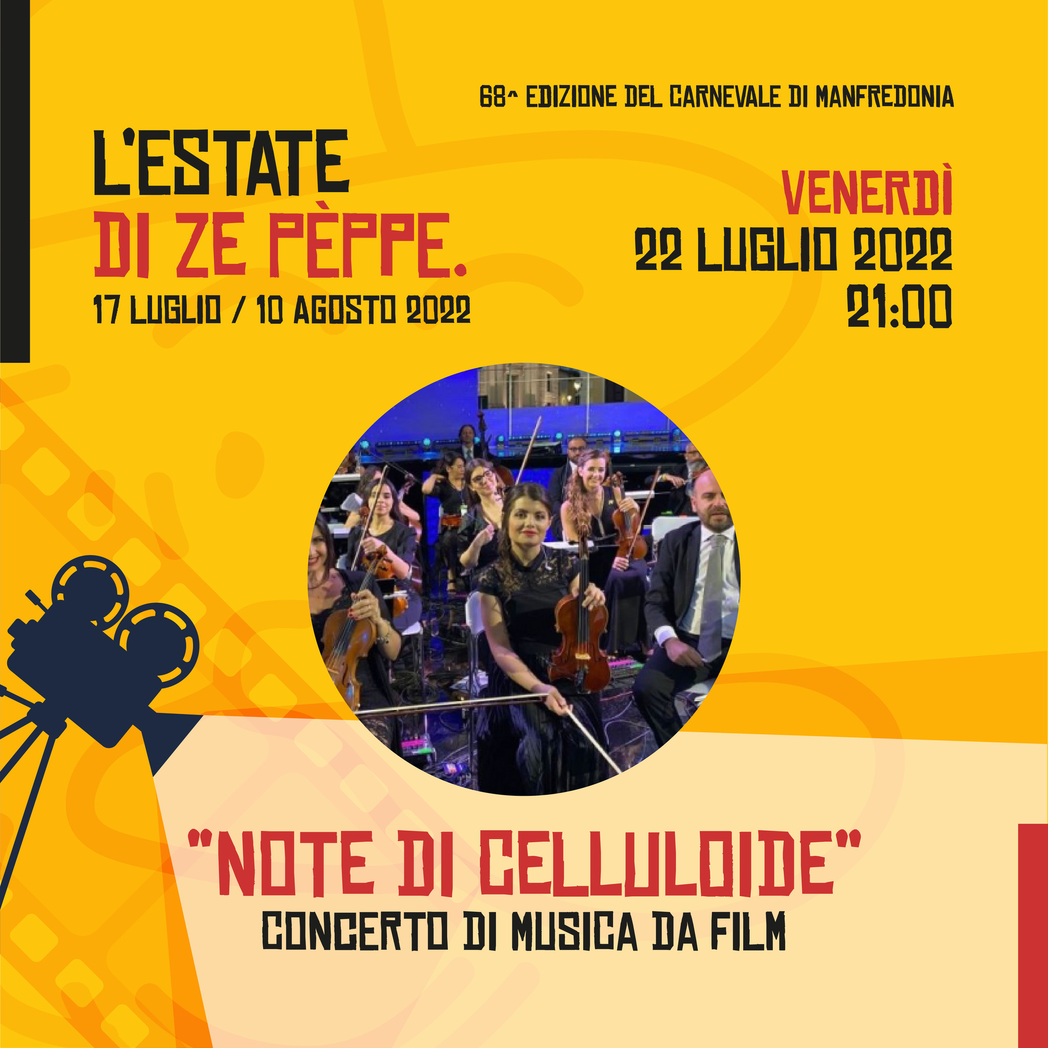 L’Estate di Ze Pèppe porta al 68° Carnevale di Manfredonia una fresca ventata di emozioni e cultura in una notte di mezz’estate. L’appuntamento è per domani (venerdì 22 luglio) alle ore 21 in riva al mare in Piazza Maestri d’Ascia con “Note di celluloide – 50 anni di storia del cinema”, concerto spettacolo di Suoni del Sud.