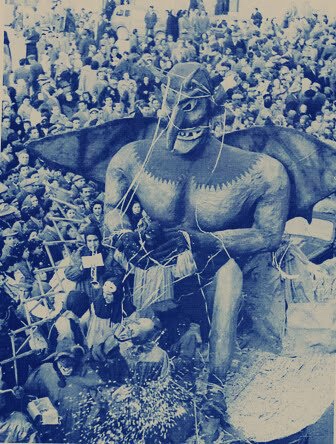 Avete presente l’abito del primitivo? Il pellicciotto? In quegli anni le mutande erano larghe e senza molla all’inguine; dato l’altezza del carro, Giovanni non s’era accorto che le sue noci pendevano e sventolavano agli occhi delle persone, che ridevano da matti, Giovanni pensava che gustassero il loro creativo lavoro … anche, ma la stanchezza era tanta e non si avvedeva in mezzo a quella folla che lo stordiva per il rumore. Non aveva capito un bel niente!E lui con una smorfia di sorriso ossequiava con ringraziamento !