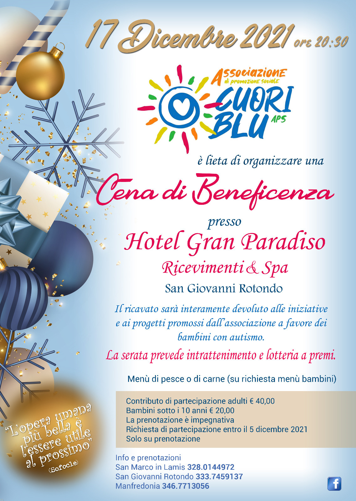 È partita a ritmo serrato l’organizzazione della cena di beneficenza che l’associazione “Cuori Blu” ha prospettato per la serata di venerdì 17 dicembre.