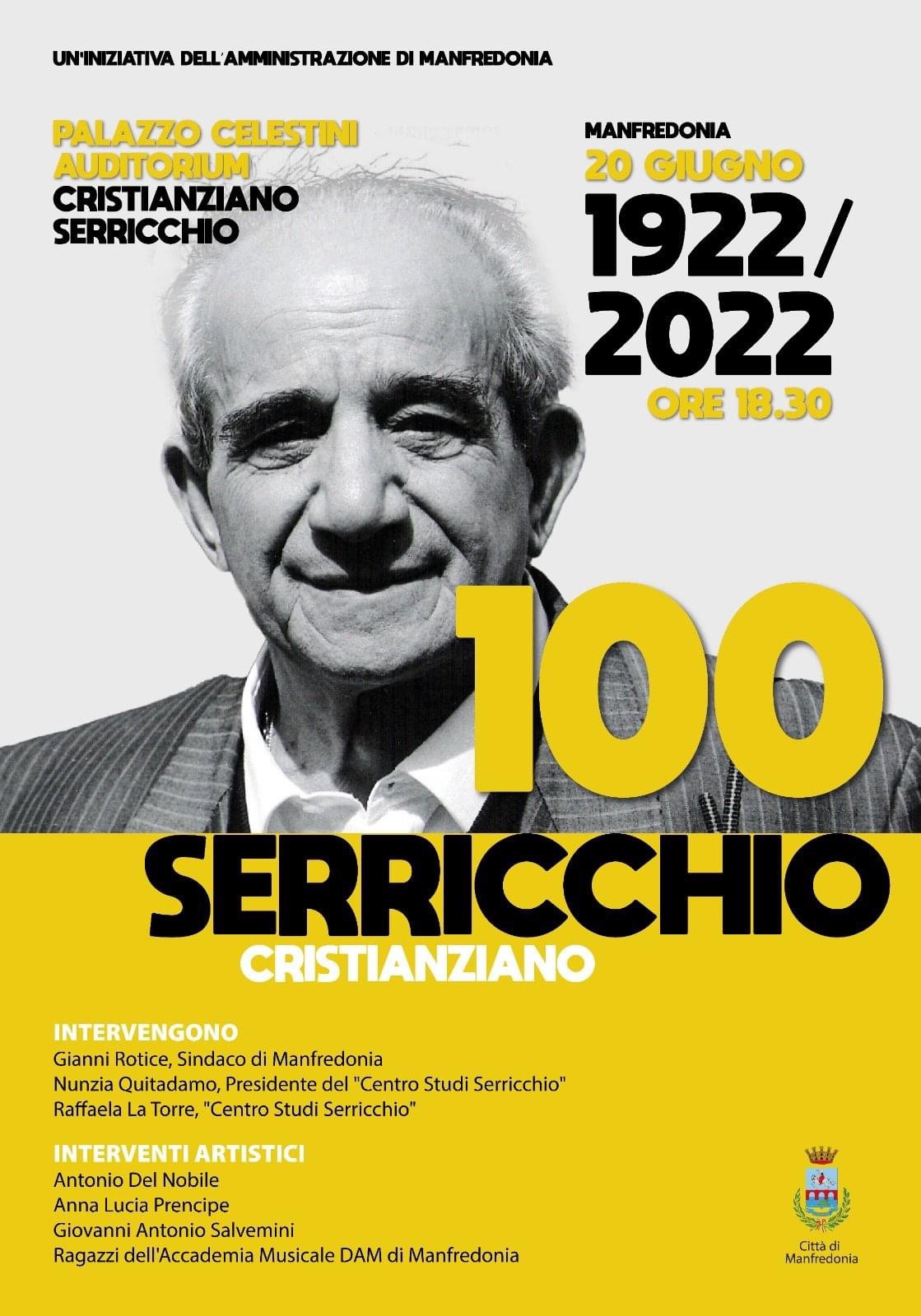 Nel giorno in cui ricorre il centesimo anno della sua nascita, Cristianziano Serricchio viene celebrato a Manfredonia con un evento istituzionale ed artistico organizzato dall’Amministrazione comunale di concerto con il “Centro Studi Serricchio”.