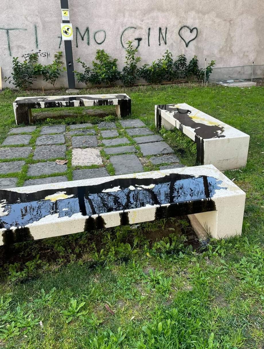 Le panchine sono state imbrattate con olio esausto per veicoli.