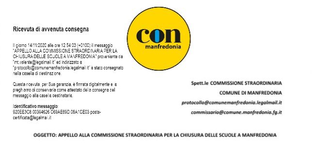 Questa mattina la portavoce del comitato civico CON MANFREDONIA, Maria Teresa Valente, ha provveduto all’invio a mezzo pec dell’appello alla Commissione Straordinaria del Comune di Manfredonia per “l’adozione di ulteriori e più restrittive misure nel territorio comunale in grado di contrastare efficacemente la diffusione del Covid-19, in primis la sospensione dell’attività didattica in presenza nelle scuole locali di ogni ordine e grado”.