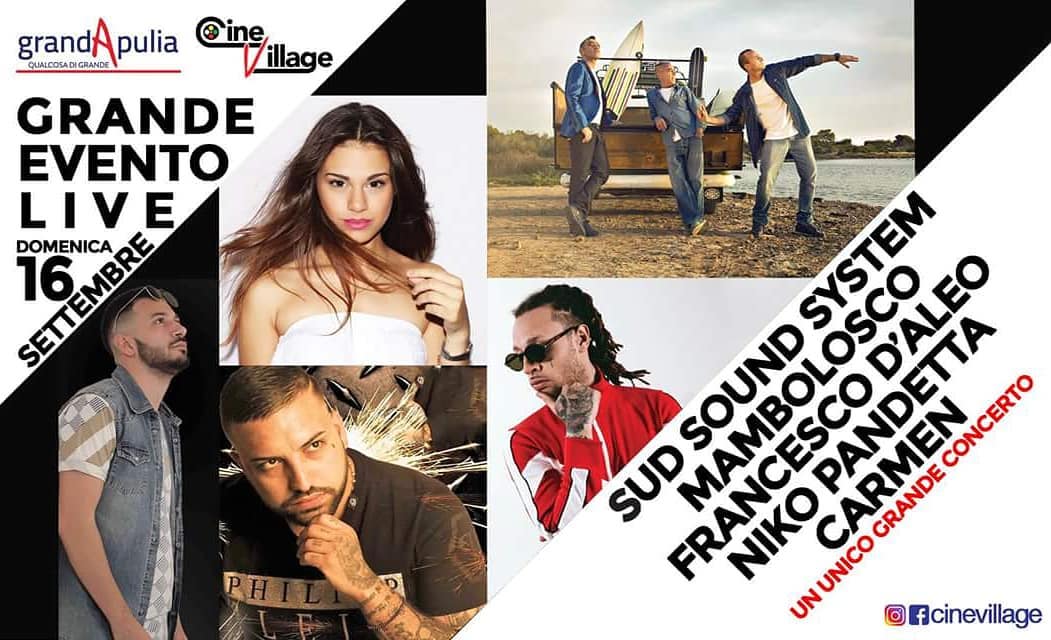 MamboLosco, Sud Sound System, Carmen Ferreri, Niko Pandetta e Francesco D’Aleo. Sono i cinque artisti che il CineVillage ha scelto per un grande evento di musica in programma domenica 16 settembre.Un appuntamento che accontenta gli amanti del rap, del reggae, della musica italiana, ma anche gli appassionati del genere neomelodico.