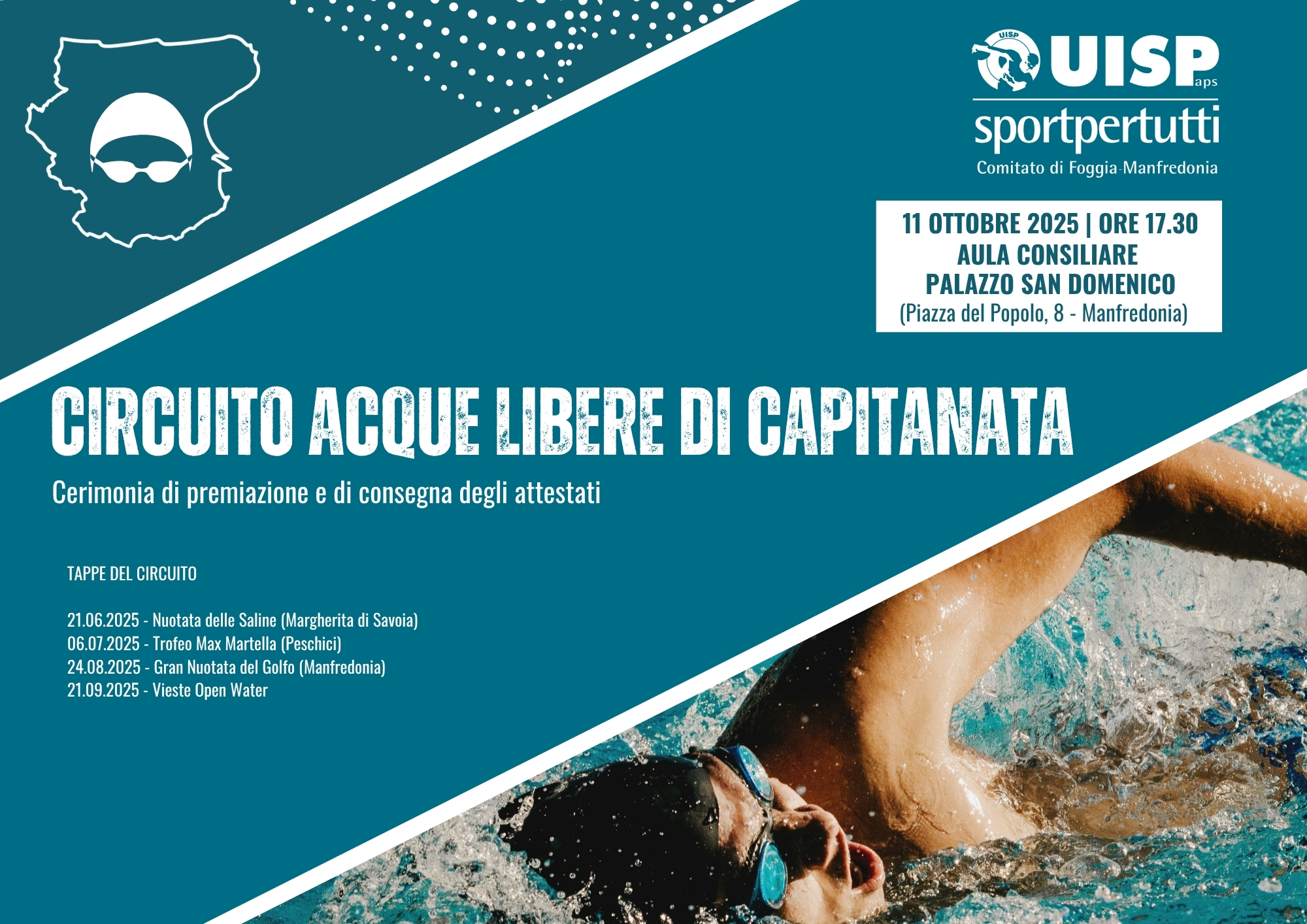 Sabato 11 ottobre 2025, alle ore 17.30, presso l’Aula Consiliare di Palazzo San Domenico a Manfredonia (Piazza del Popolo, 8) si terrà la cerimonia di premiazione e consegna degli attestati del Circuito di Capitanata di Nuoto in Acque Libere, promosso dalla UISP Comitato di Foggia-Manfredonia.