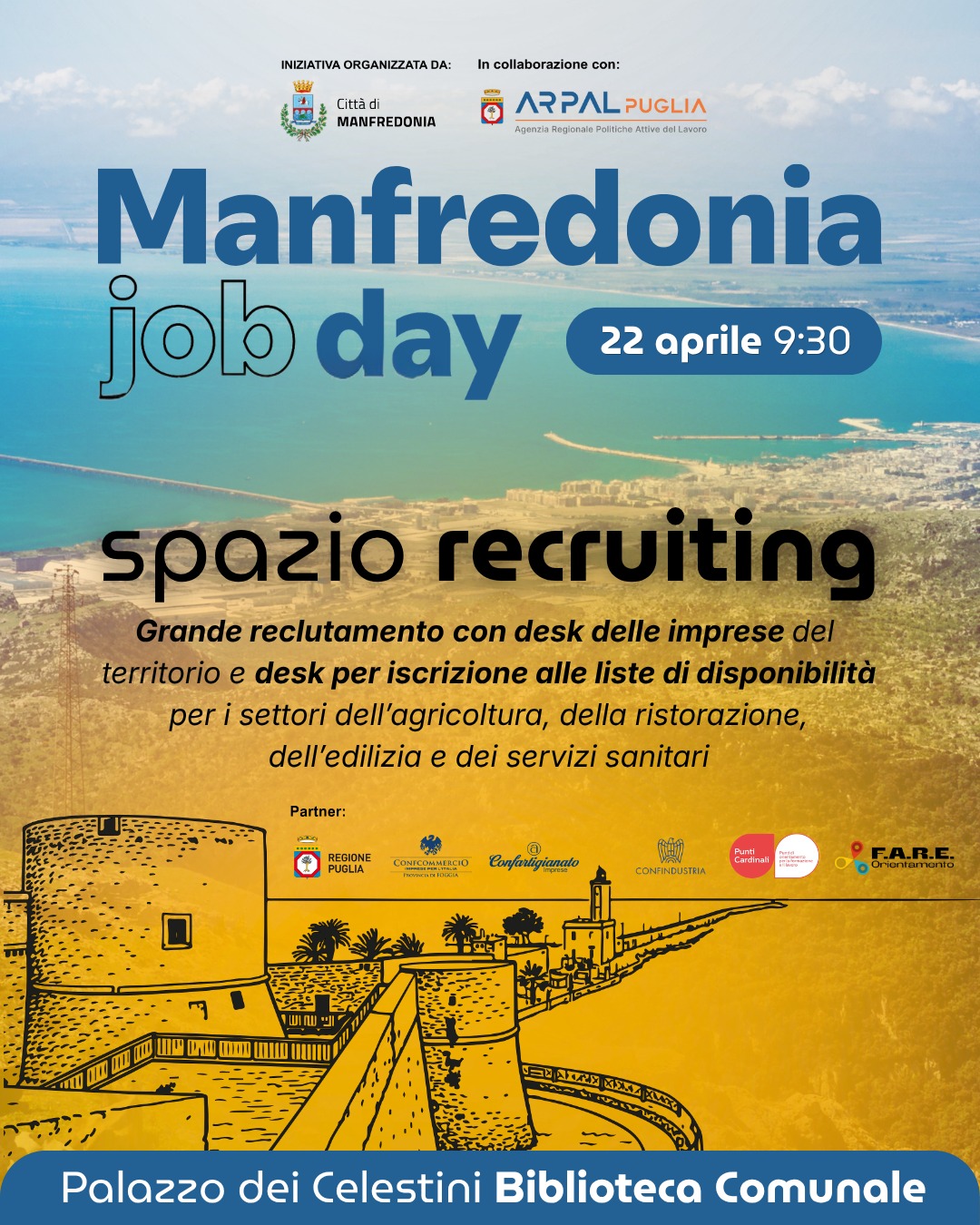 Manfredonia, 16 aprile 2026 – Si terrà martedì 22 aprile a Manfredonia il “Manfredonia Job Day”, promosso dal Comune di Manfredonia in collaborazione con il Centro per l’impiego di Manfredonia – ARPAL Puglia, con il coinvolgimento della Camera di Commercio di Foggia, Confcommercio Foggia, Confindustria Foggia e Confartigianato Foggia, come momento concreto di incontro tra imprese, cittadini e persone in cerca di occupazione.