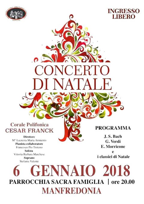 In conclusione delle festività natalizie il 6 gennaio 2018 l’Associazione culturale Corale Polifonica “Cèsar Franck” di Manfredonia invita la cittadinanza al Concerto di Natale che si terrà alle ore 20:00 presso la Parrocchia Sacra Famiglia di Manfredonia, con un repertorio musicale di brani classici e natalizi.