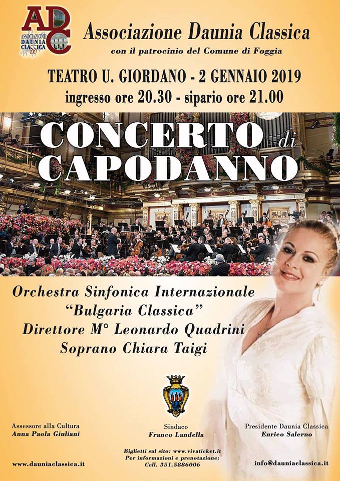 Torna al Teatro Umberto Giordano di Foggia il “Concerto di Capodanno” organizzato dall’Associazione Daunia Classica, in collaborazione col Comune di Foggia, giunto ormai alla sua quarta edizione. Il Concerto che si terrà il giorno 02 gennaio 2019 avrà un programma musicale allegro e accattivante, ma anche intimo e affascinante, composto dei brani più famosi della tradizione austro-ungarica e della lirica italiana del periodo romantico. Il prezioso ambiente musicale sarà arricchito dalla partecipazione vocale del famoso soprano romano, Chiara Taigi, artista la cui levatura è riconosciuta a livello internazionale, donna affascinante e Regina indiscussa dell’opera lirica italiana. La accompagneranno in questo meraviglioso viaggio musicale gli egregi maestri dell’Orchestra Sinfonica Internazionale “Bulgaria Classica”, diretti dallo stimatissimo M° Leonardo Quadrini, direttore d’orchestra e pianista di fama internazionale.