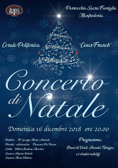 Per celebrare l’apertura delle festività natalizie il 16 dicembre 2018 l’Associazione culturale Corale Polifonica “Cèsar Franck” di Manfredonia invita la cittadinanza al Concerto di Natale che si terrà alle ore 20:00 presso la Parrocchia Sacra Famiglia di Manfredonia, con un repertorio musicale di brani classici e natalizi.