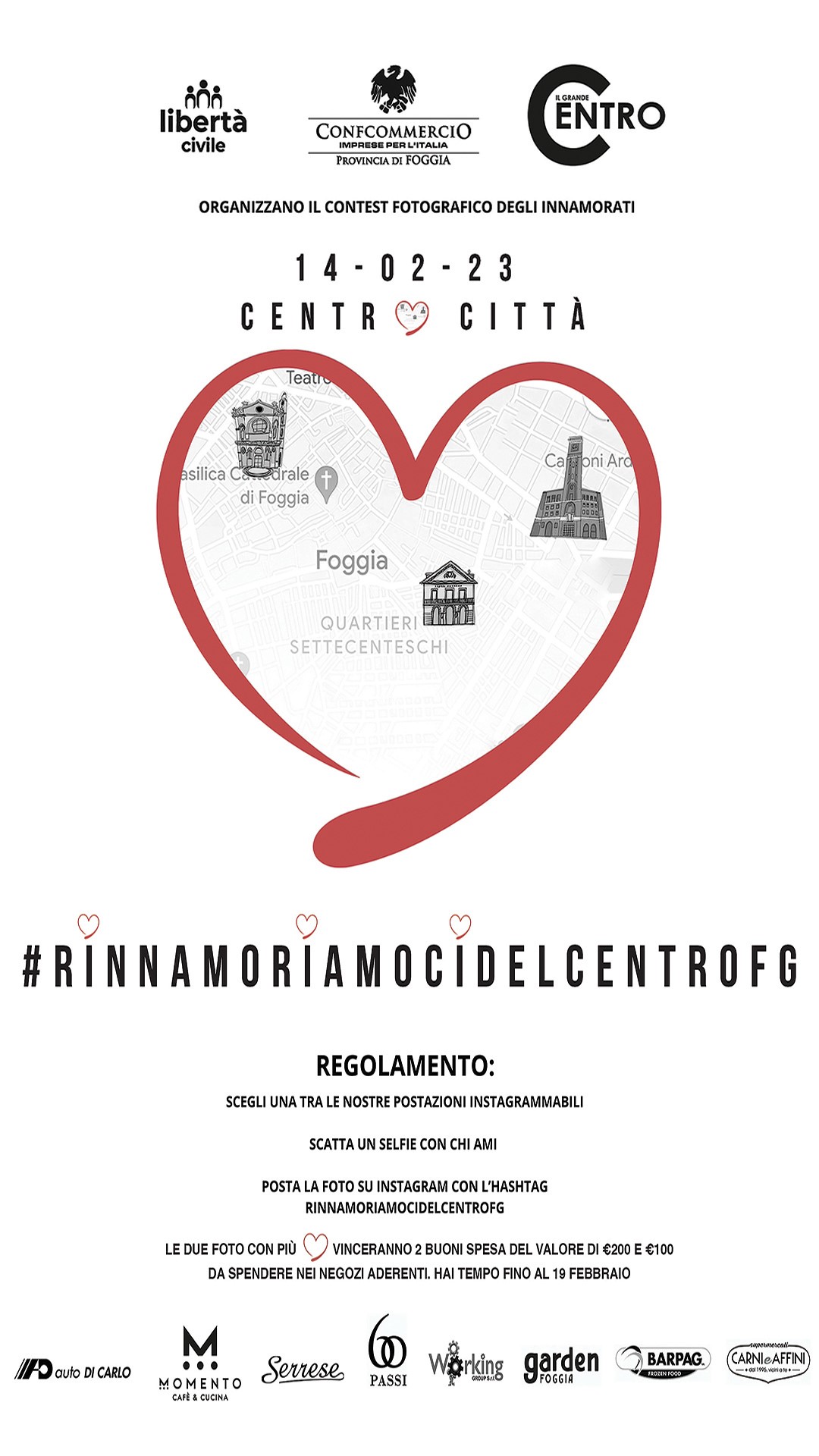 #rinnamoriamocidelcentrofg è il contest fotografico organizzato dall’Associazione Libertà civile, Confcommercio Imprese per l’Italia provincia di Foggia e il CIV Il Grande Centro che si terrà il 14 febbraio in occasione della festività di San Valentino.