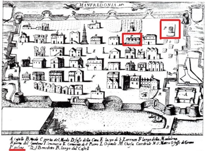 La mancanza di sorgenti d’acqua dolce, secondo il frate Michelangelo Manicone, ha costretto i sipontini a costruire delle piscine, ovvero serbatoi pubblici di raccolta di acqua piovana. Queste cisterne, a Manfredonia, erano ubicate principalmente nei pressi del Convento di S. Maria delle Grazie e presso il piano delle fosse, come appare anche dalla pianta della città realizzata dall’abate Pacichelli[12]. In particolare il frate descrive le prime affermando che il «suolo esterno è murato, selciato, ed ha un dolce pendìo»[13]. Lì vi sono 9 «bocche, onde attingesi l’acqua» e «sono alquanto elevate dal suolo. L’ingresso al Sud è alquanto elegante»[14].