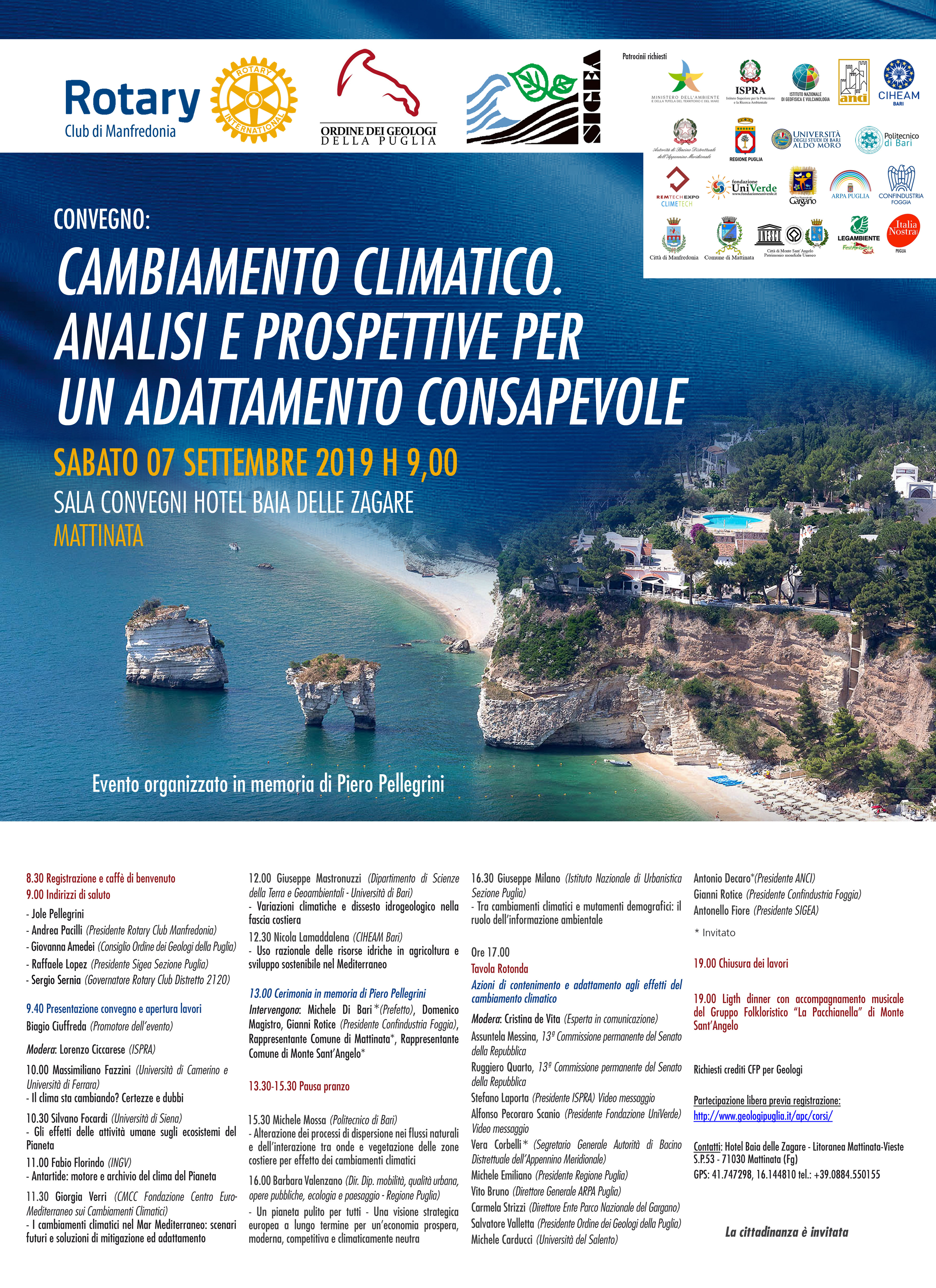 Si svolgerà sabato 7 settembre 2019, a partire dalle ore 9 fino al pomeriggio, presso la Sala Convegni Hotel Baia delle Zagare a Mattinata, un impegnativo convegno organizzato dal Rotary Club di Manfredonia, dall’Ordine dei Geologi della Puglia e dalla Società Italiana di Geologia Ambientale (Sigea), che affronterà i temi del cambiamento climatico e dell’adattamento consapevole.