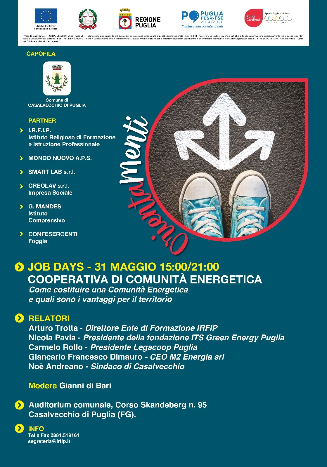L’incontro è uno dei Job days previsto dal progetto Orientamenti, finanziato dalla Regione Puglia con il bando Punti Cardinali, di cui il Comune di Casalvecchio di Puglia è capofila.