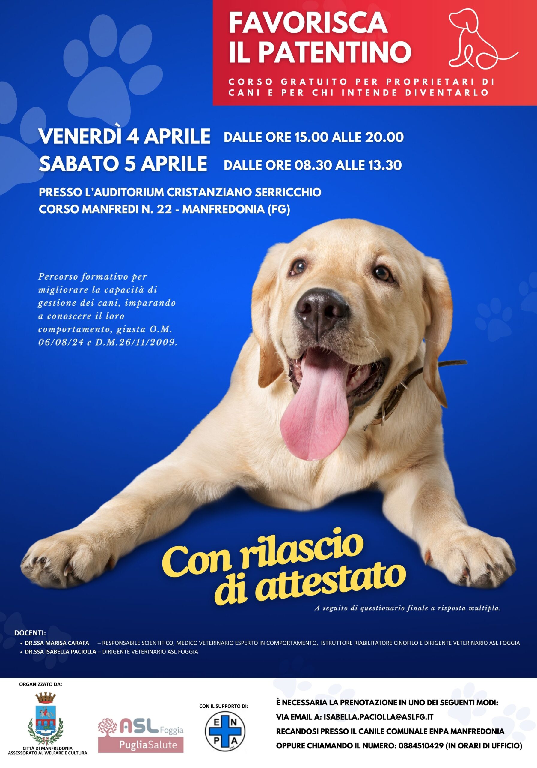 GESTIRE IL CANE CON RESPONSABILITÀ: CORSO GRATUITO A MANFREDONIA CON RILASCIO DEL PATENTINO