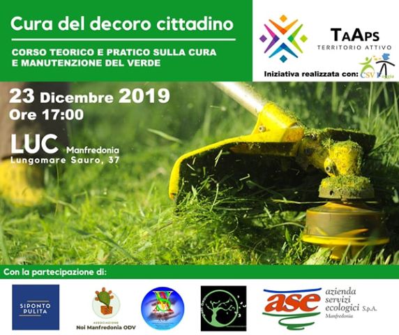 L’associazione Territorio Attivo Aps organizza in data 23 dicembre 2019 presso il LUC di Manfredonia un corso di formazione sulla Manutenzione del Verde, raccogliendo l’adesione delle maggiori organizzazioni che si sono occupate di questo in maniera spontanea e volontaria nel territorio di Manfredonia quest’anno.