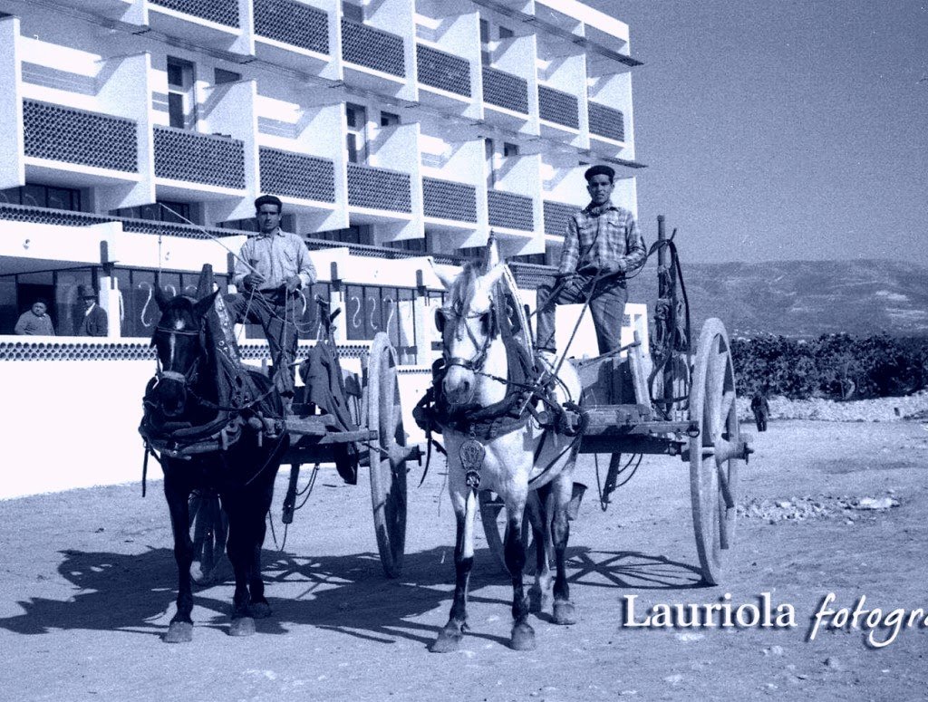 Foto: dei maestri fotografi Lauriola. Quando ” l’Hotel Gargano ” era ancora in costruzione, era il grande cuore di Manfredonia, rappresentava l’immagine del progresso degli anni 1960 .Con le due carrete e cavalli, passare con il materiale edile – tra la polvere bianca affacciata ad un mare azzurrissimo.