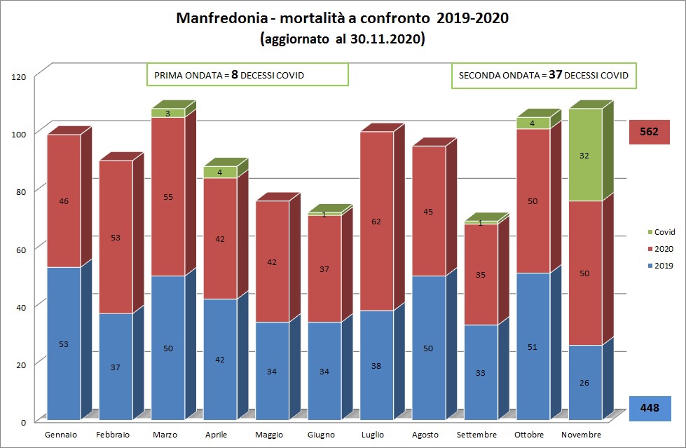 Manfredonia, nell’indifferenza generale, ha registrato nel mese di novembre un aumento della mortalità pari al 215,4%, in rapporto allo stesso periodo del 2019. Nelle città del Nord Italia il dato medio è del 75% in più, con picchi a Torino (+111%), Genova (+96%) e Milano (+83%). Un forte aumento dei decessi è evidente anche nel Centro Sud, in particolare a Roma e Bari (+ 58%), Perugia (+66%) e Palermo (+67%), ma con una media che in generale si attesta intorno al 46%.