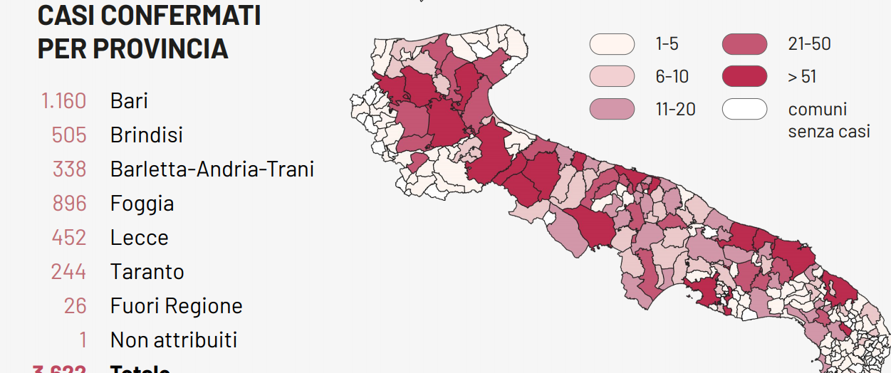 Il totale dei casi positivi Covid in Puglia è di 3.622 così divisi: