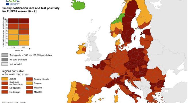 La Puglia si aggiunge a Piemonte, Lombardia, Emilia Romagna, Friuli-Venezia Giulia, Marche, Campania e Provincia di Trento tra le aree ad alta incidenza di contagio Covid, colorate in rosso scuro, nella mappa del Centro europeo per la prevenzione e il controllo delle malattie (Ecdc).