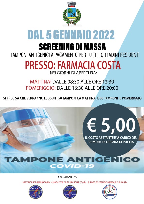 A partire da oggi, mercoledì 5 gennaio 2022, il Comune di Orsara di Puglia ha avviato lo screening anticovid di massa per tutti i cittadini orsaresi. Tra stamattina e stasera, saranno effettuati i primi 100 tamponi antigenici dalle 8.30 alle 12.30 e dalle 16.30 alle 20 di oggi. Le cittadine e i cittadini orsaresi potranno sottoporsi al tampone antigenico presso la Farmacia Costa. Ogni singolo esame costerà soltanto 5 euro, poiché la parte restante sarà a carico del Comune di Orsara di Puglia. “I dati ufficiali comunicatici dagli organismi competenti”, ha spiegato il sindaco Tommaso Lecce, “registrano ad oggi 14 positivi nel nostro paese, ma i contagi sono in aumento, poiché soltanto 24 ore prima i positivi accertati erano 10. Com’è ovvio, naturalmente, stiamo monitorando costantemente la situazione. Per questo motivo abbiamo deciso di favorire prevenzione e monitoraggio con lo screening di massa che partirà oggi e proseguirà nei prossimi giorni. E’ una misura sulla quale il Comune di Orsara ha inteso investire perché potrà aiutarci a individuare nuovi casi e a procedere con le conseguenti quarantene. Comprendo appieno la preoccupazione dei cittadini, è del tutto evidente che il numero dei contagi accertati sta aumentando come del resto avviene in ogni parte d’Italia, ma è bene non generare allarmismi ed evitare di alimentare voci infondate su numeri che non hanno riscontri ufficiali e certificati. Abbiamo a disposizione tre strumenti semplici e fondamentali da attuare per limitare al minimo i rischi: vaccinarsi, utilizzare la mascherina e, se possibile, usufruire delle giornate di screening che cominceranno oggi con i primi 100 tamponi. Tutti vediamo i tg nazionali e leggiamo le notizie sulla ripresa dei contagi, è una situazione di cui bisogna avere piena coscienza, in modo da osservare un comportamento scrupoloso e attento verso se stessi e verso gli altri”.