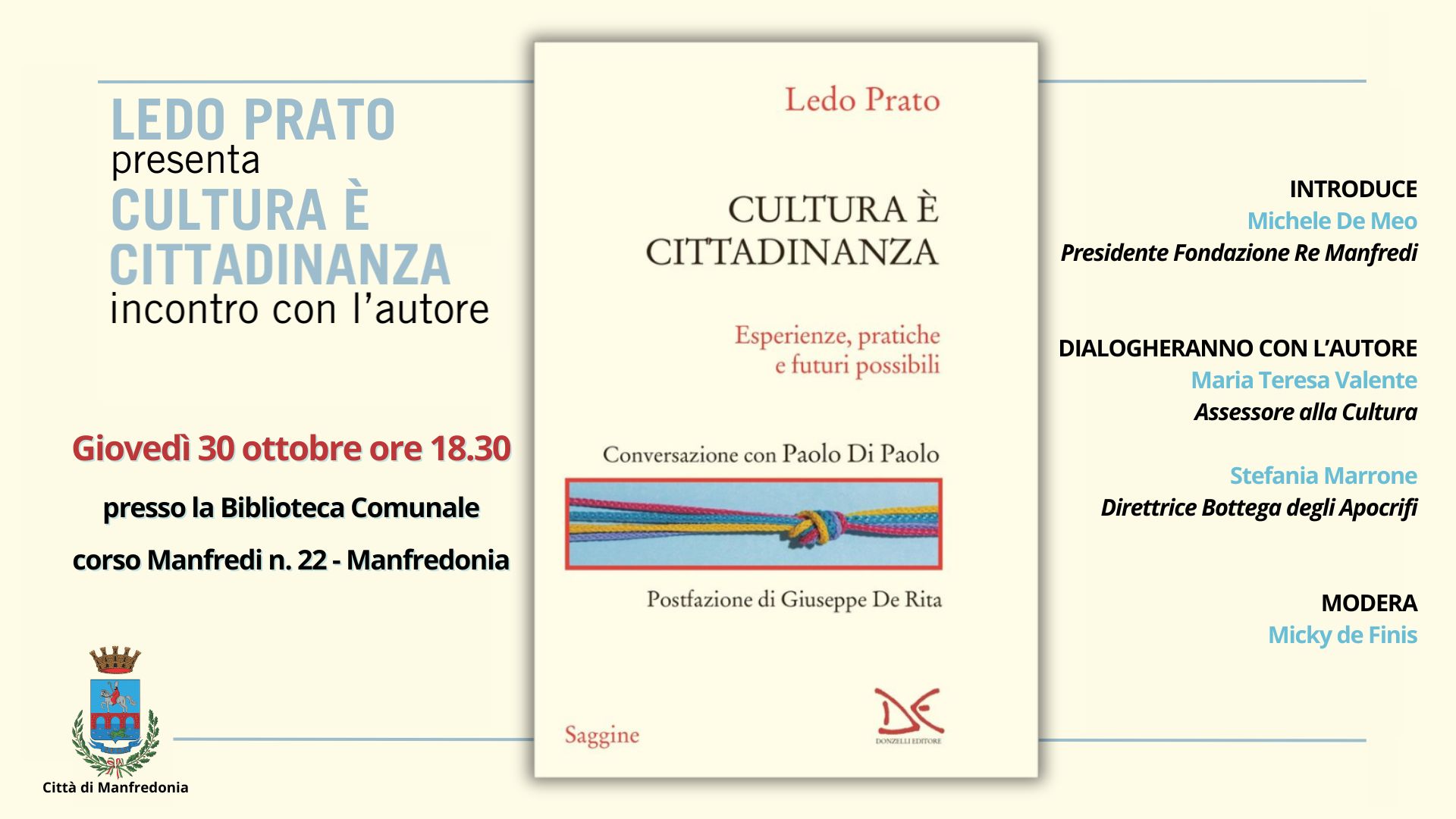 Giovedì 30 ottobre alle ore 18.30, presso la Biblioteca Comunale di Manfredonia (Corso Manfredi 22 – Palazzo dei Celestini), si terrà la presentazione del libro “Cultura è cittadinanza. Esperienze, pratiche e futuri possibili” di Ledo Prato, edito da Donzelli Editore.