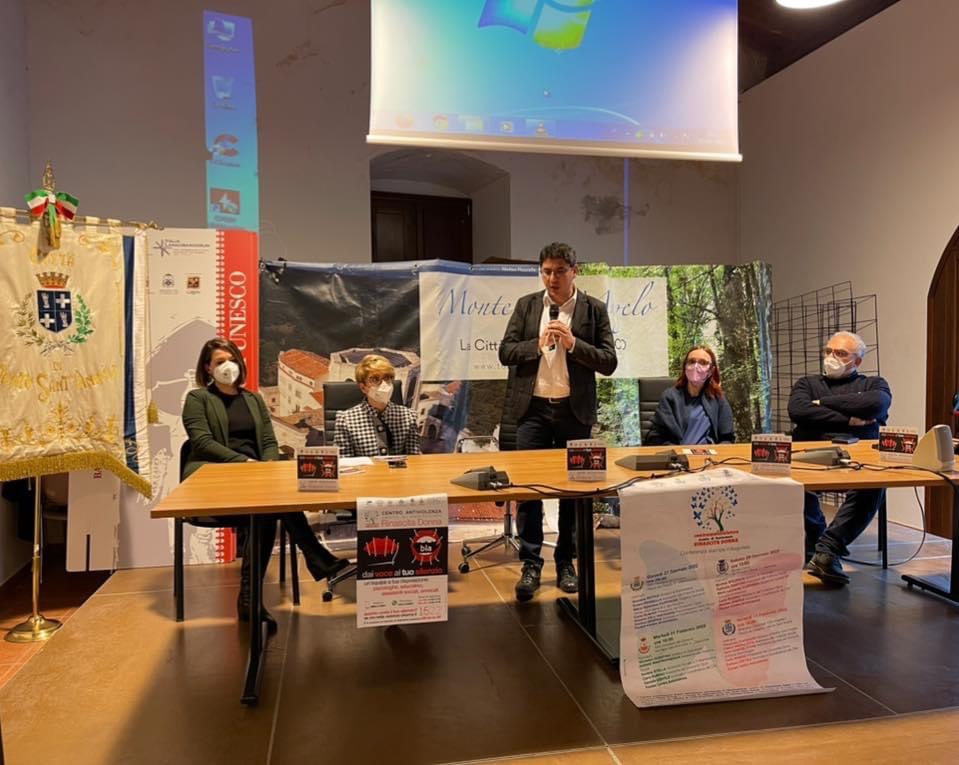 Con il sindaco Pierpaolo d’Arienzo, l’assessore al welfare Libera Armillotta, l’Assistente Sociale del Comune di Monte Sant’Angelo Ilaria Conoscitore, Carlo Rubino (Presidente del Consorzio Opus) e Daniela Gentile (Avvocata e Coordinatrice del CAV).