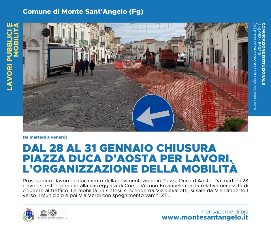 Piazza Duca D’Aosta è interessata da lavori di rifacimento della pavimentazione e, a far data dal 28 gennaio 2025, tali lavori si estenderanno alla carreggiata di corso Vittorio Emanuele, determinandone la chiusura dall’incrocio di via Fandetti. Ravvisata la necessità di procedere alla chiusura di corso Vittorio Emanuele, per consentire i lavori di cui trattasi, dall’incrocio di Via Umberto I fino all’incrocio con via Cavallotti