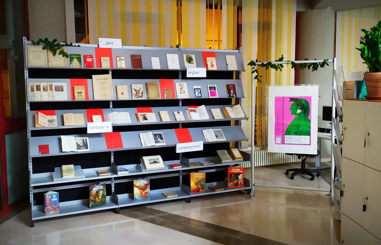 Grazie a un’idea del bibliotecario Marco Tricarico, da oggi troverete all’ingresso della biblioteca una esposizione di tutti i libri dedicati a Dante presenti in struttura: dalla prima biografia, quel “Trattatello in laude di Dante” scritto da Boccaccio, fino a “Il mio Dante” di Benigni, che ce lo ha fatto riscoprire grazie alle sue letture televisive, passando per un “Dante nell’era spaziale” degli anni ’70, o per una edizione della Commedia con la prefazione di Giuseppe Mazzini.