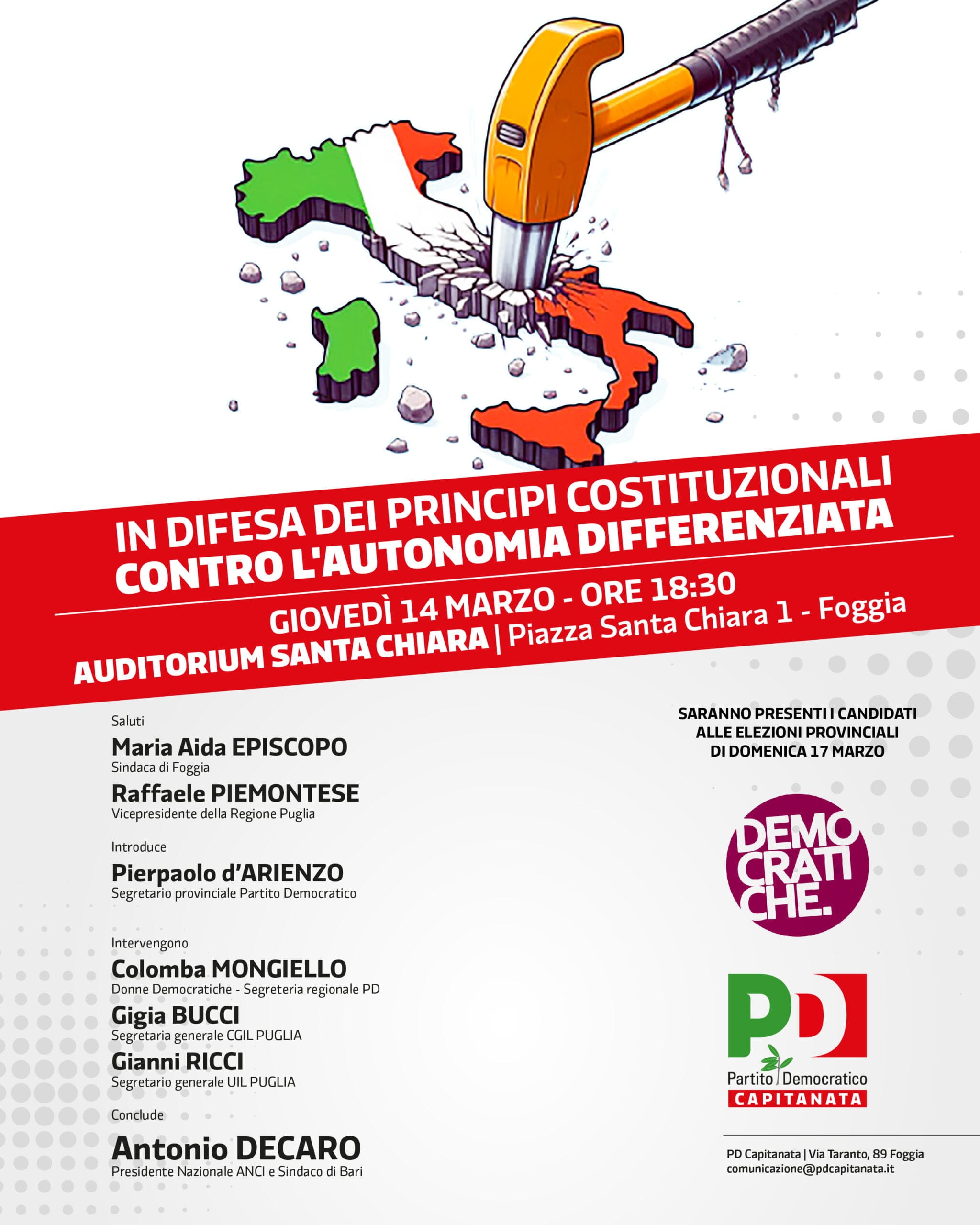 Si svolgerà giovedì 14 marzo, presso l’Auditorium Santa Chiara di Foggia (Piazza Santa Chiara, 1) alle ore 18:30, l’evento promosso dal Partito Democratico Capitanata “in difesa dei principi costituzionali contro l’autonomia differenziata”.