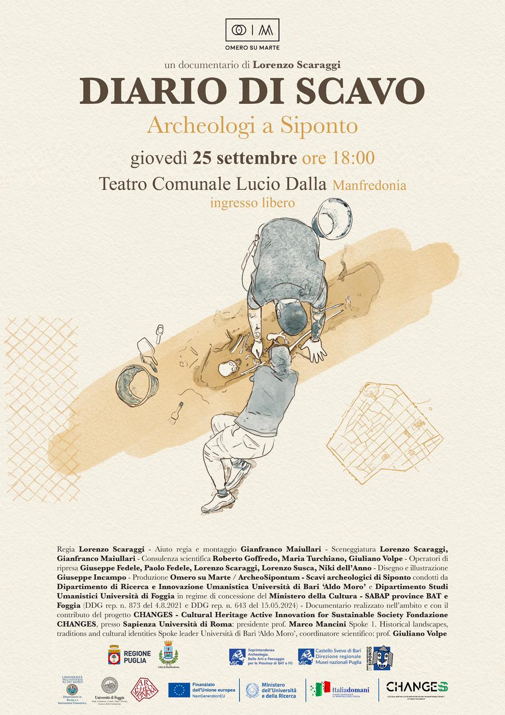 Regia Lorenzo Scaraggi – Aiuto regia e montaggio Gianfranco Maiullari – Sceneggiatura Lorenzo Scaraggi, Gianfranco Maiullari – Consulenza scientifica Roberto Goffredo, Maria Turchiano, Giuliano Volpe – Operatori di ripresa Giuseppe Fedele, Paolo Fedele, Lorenzo Scaraggi, Lorenzo Susca, Niki dell’Anno – Disegno e illustrazione Giuseppe Incampo – Produzione Omero su Marte / ArcheoSipontum – Scavi archeologici di Siponto condotti da Dipartimento di Ricerca e Innovazione Umanistica Università di Bari ‘Aldo Moro’ e Dipartimento Studi Umanistici Università di Foggia in regime di concessione del Ministero della Cultura – SABAP province BAT e Foggia (DDG rep. n. 873 del 4.8.2021 e DDG rep. n. 643 del 15.05.2024) – Documentario realizzato nell’ambito e con il contributo del progetto CHANGES – Cultural Heritage Active Innovation for Sustainable Society Fondazione CHANGES, presso Sapienza Università di Roma: presidente prof. Marco Mancini Spoke 1. Historical landscapes,traditions and cultural identities Spoke leader Università di Bari ‘Aldo Moro’, coordinatore scientifico: prof. Giuliano Volpe