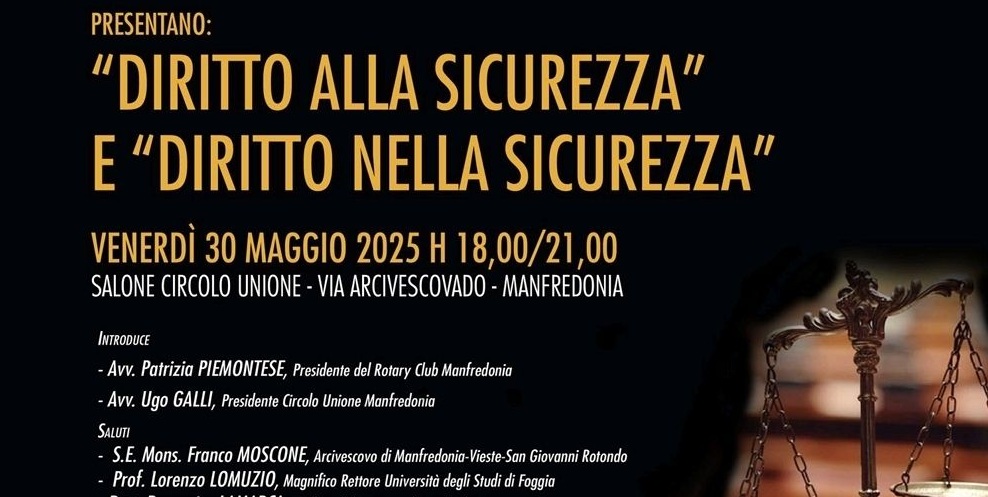 Il 30 maggio, presso il Salone del Circolo Unione di Manfredonia,si è tenuto il convegno a tema “Diritto alla sicurezza” e “Diritto nella sicurezza”, organizzato dal Rotary Club di Manfredonia, con il patrocinio del Circolo Unione, l’Ordine degli Avvocati di Foggia, l’Unione Avvocati Manfredonia.