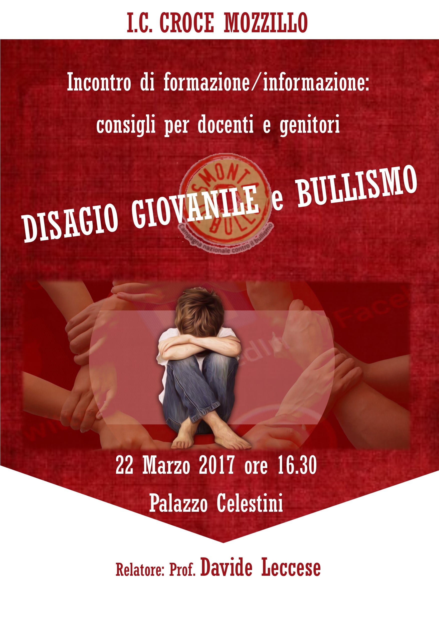 Il 22 marzo, alle ore 16.30, a palazzo Celestini, il prof. Leccese ci offrirà preziose chiavi di lettura dei nostri ragazzi, così che noi possiamo farli divenire attori protagonisti di comportamenti accorti e virtuosi, seme prezioso per debellare un fenomeno tanto avvilente quanto pericoloso come il bullismo.