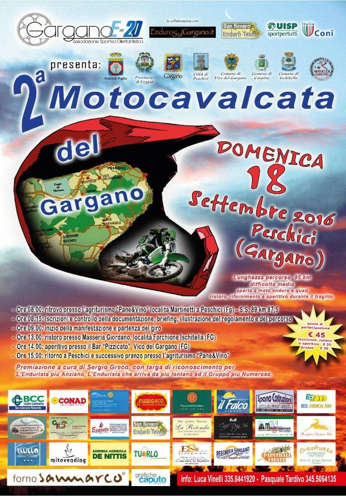 L’associazione sportiva GarganoE20 di San Giovanni Rotondo organizza domenica 18 settembre la 2ª edizione della Motocavalcata del Gargano. L’evento dal carattere non agonistico, riservato a moto di tipo enduro e quad, si svolgerà nei territori dei comuni di Peschici, Vico del Gargano, Ischitella e Carpino. Con partenza e arrivo presso l’agriturismo “Pane e Vino” di Peschici.
