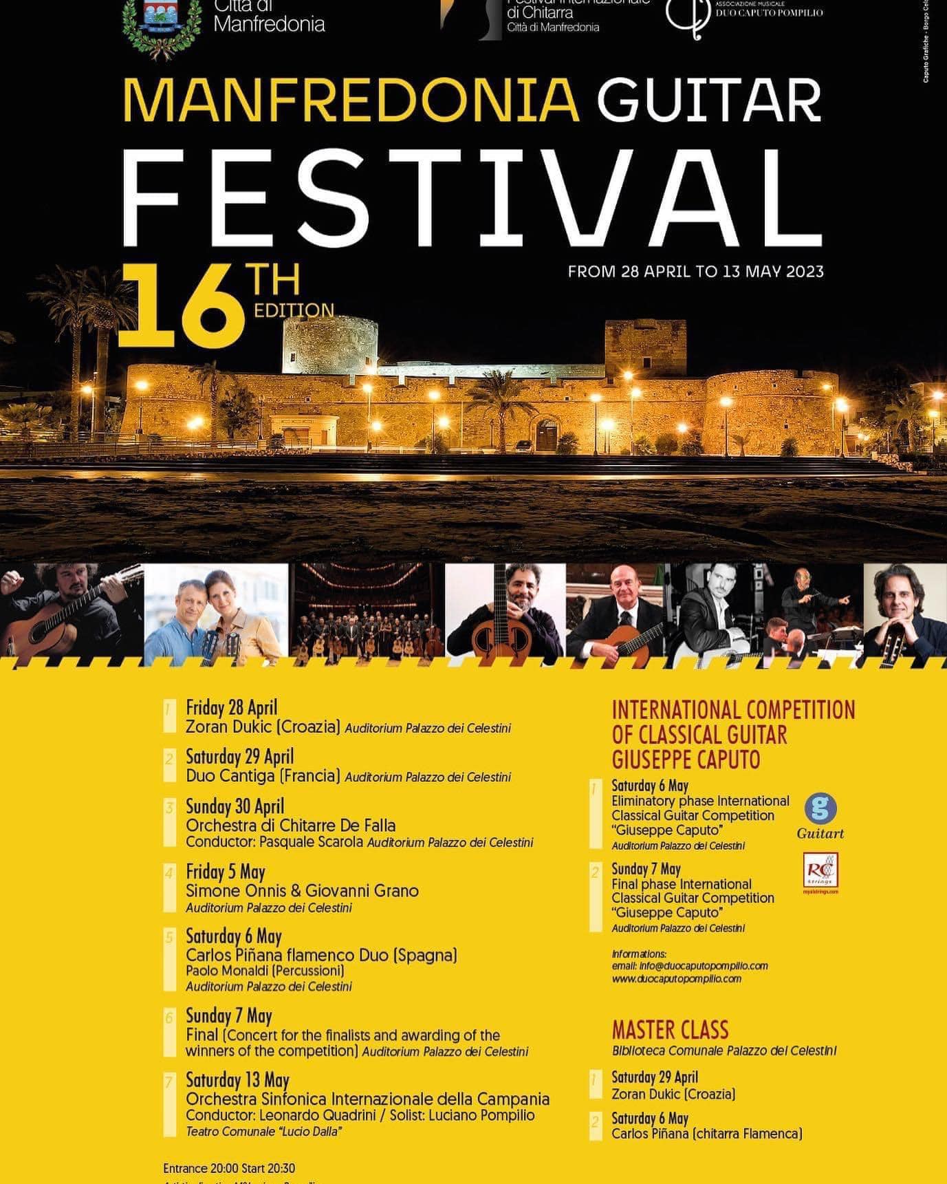 Grande successo di pubblico e di partecipanti per il Festival Internazionale della Chitarra “Città di Manfredonia” che sabato 13 maggio conclude la sua XVI edizione con il “Concierto de Aranjuez – para guitarra y orquesta” del M. Luciano Pompilio e dell’Orchestra Sinfonica Internazionale della Campania diretta dal M. Leonardo Quadrini presso il Teatro Comunale Lucio Dalla (ingresso libero, ore 20).