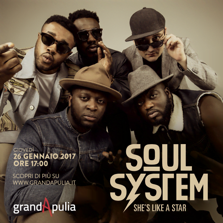 Foggia, prima tappa pugliese e GrandApulia, primo grande palcoscenico per la band rivelazione di X-Factor che, capitanata da Alvàro Soler, loro giudice, si è affermata come primo gruppo in Italia a vincere l’ambito talent. Il loro singolo “She’s like a Star”, con oltre 360.000 visualizzazioni in una sola settimana, è già Disco d’Oro e il loro anno pieno di appuntamenti. Ma prima di San Remo e del tour, ilsound “soul” dei Soul Systempassa da Foggia e dal Grandapulia.