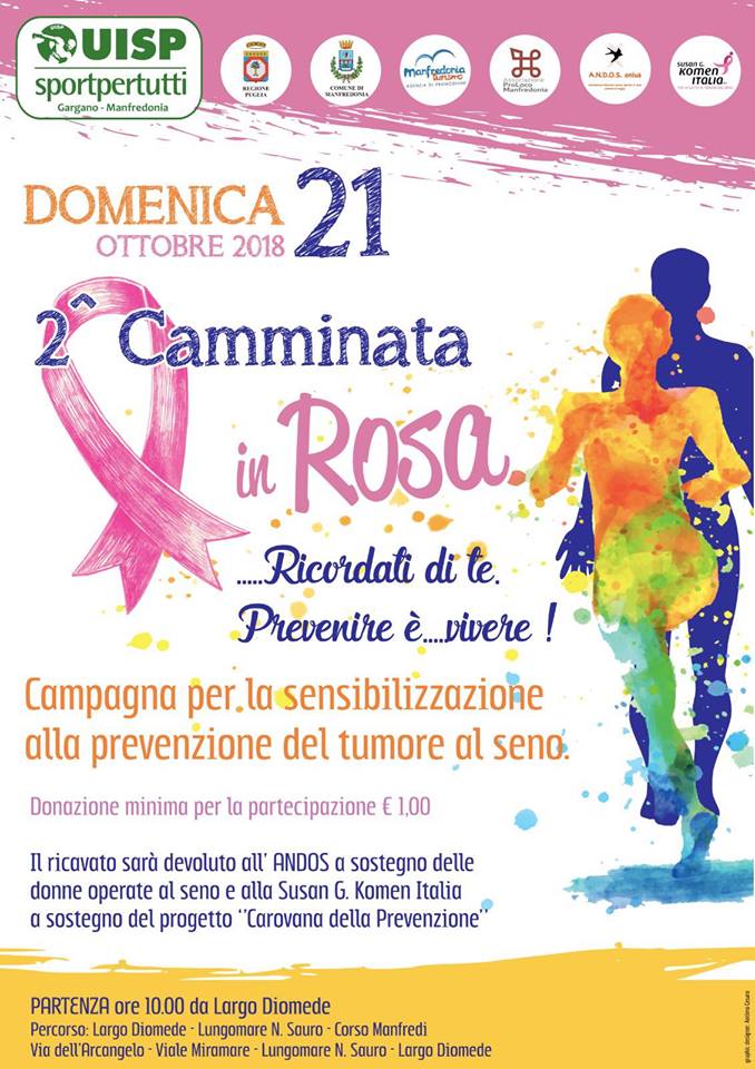 Tutto Terminerà con l’evento Clou del cartellone promosso dalla UISP con la Seconda Edizione della Camminata in Rosa che inizierà alle ore 10.00 di Domenica 21 Ottobre da Largo Diomede. Una Camminata, non una corsa, ma una Camminata da svolgere con la Famiglia con i Bambini e anche con gli anziani. Che dopo largo diomede giungerà in Lungomare Nazario Sauro poi per corso Manfredi, via dell’arcangelo fino a Viale Miramare per poi rientrare a Largo Diomede. Tutti coloro che vorranno potranno acquistare la Maglia dell’evento con una donazione Minima di 1,00 euro Questo in Onore delle Donne e della Prevenzione al Tumore al Seno. Varie attività della città hanno contribuito alla Manifestazione e i giorni 19 e 20 Ottobre all’interno delle loro attività indosseranno le Maglie Rosa dell’Evento!
