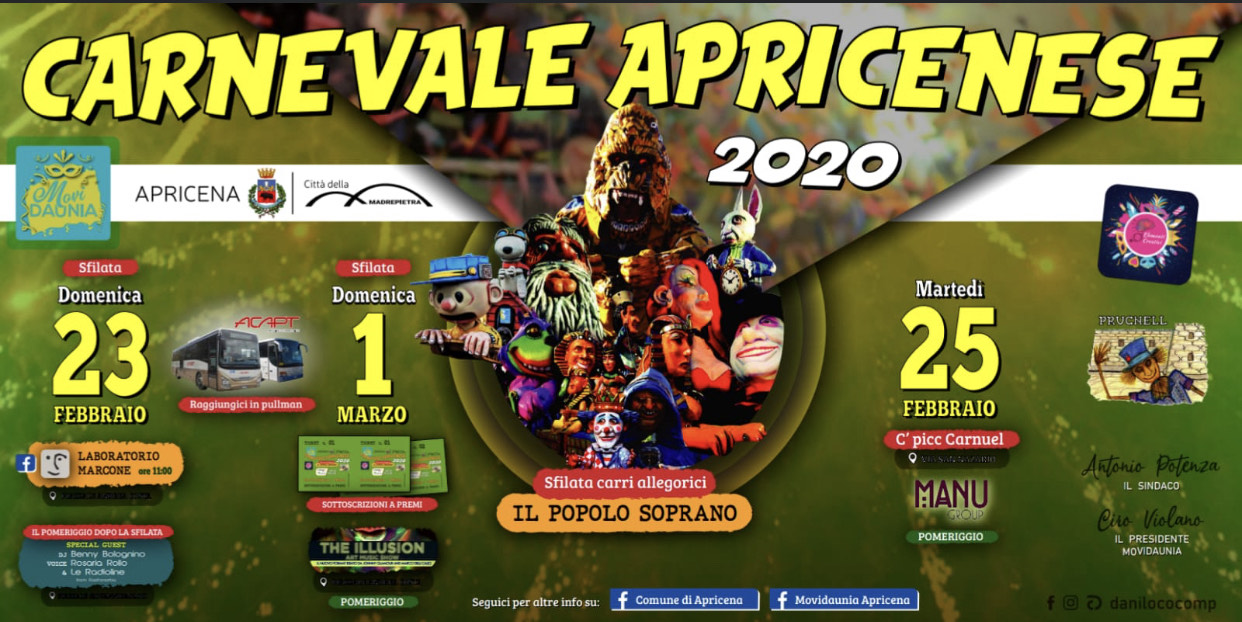 arà anche l’occasione per ascoltare la nuova sigla del Carnevale Apricenese cantata dal noto musicista Matteo Marolla e dalla sua orchestra. “C’è molto fermento in città, soprattutto tra i più piccoli” – dichiara il Sindaco Antonio Potenza – “sentiamo molto entusiasmo in giro, ci aspettiamo moltissima gente che arriverà da altri paesi.