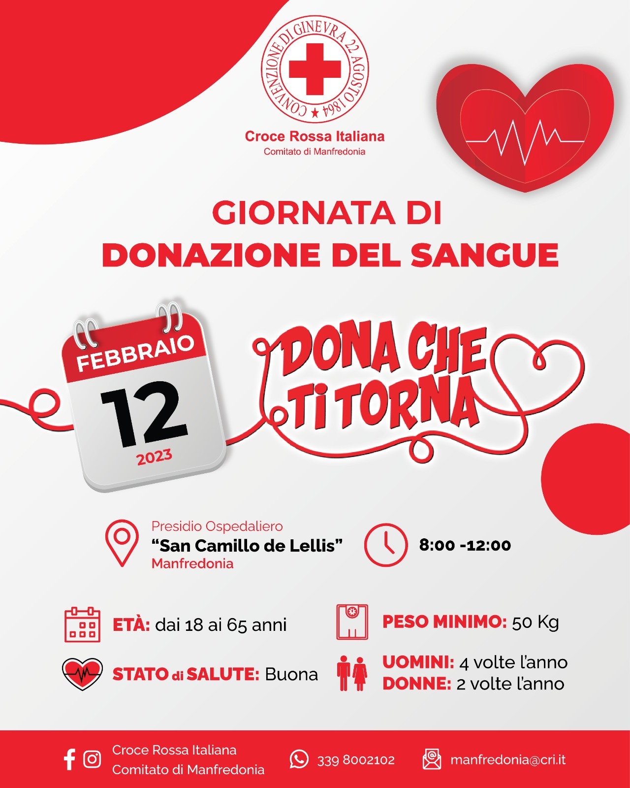 Con queste parole il presidente del Comitato Territoriale di Manfredonia, Andrea Nobile, presenta la campagna 2023 di Croce Rossa “Dona che ti torna!”, che culminerà nella giornata di domenica 12 febbraio presso il Centro Trasfusionale del P.O. San Camillo di Manfredonia.