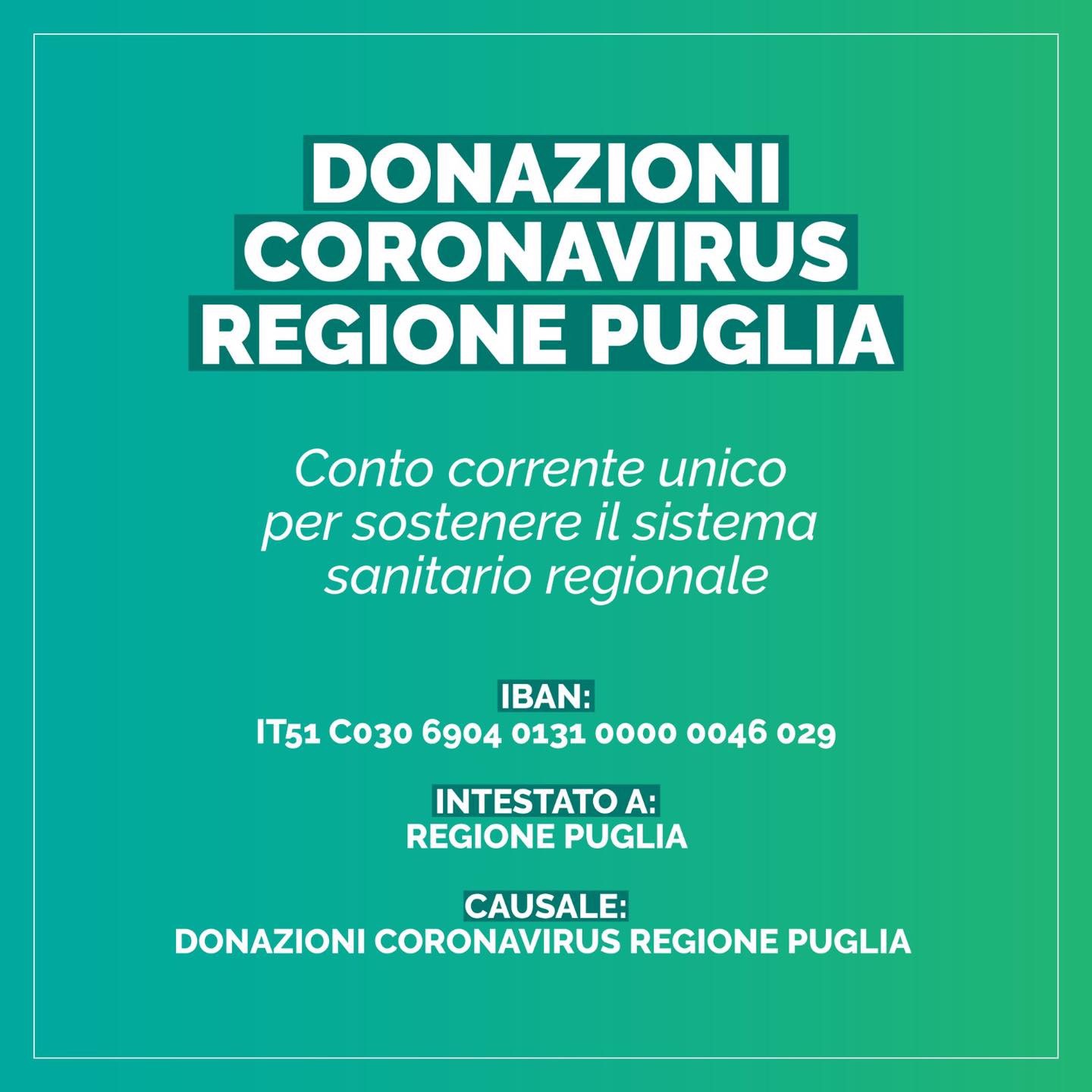 Ringrazio tutti i cittadini per aver messo in moto spontaneamente questa catena di aiuti. Chi vuole dare una mano agli sforzi del sistema sanitario pugliese può da oggi utilizzare questo Iban ufficiale per le donazioni, che ci è stato richiesto da molti e che permetterà di agire imparzialmente sul territorio pugliese, in modo trasparente, a seconda delle necessità più urgenti.