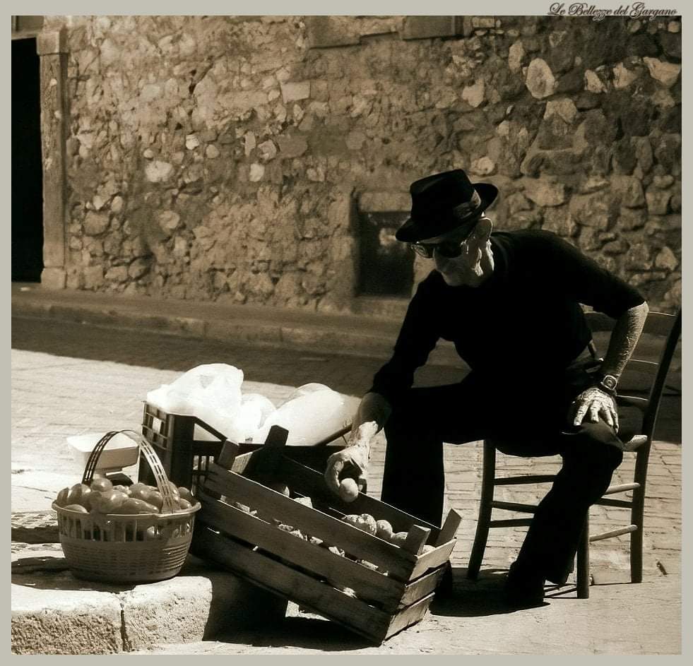 Manfredonia – ANNI ’60 Vicolo Esperia angolo Via San Francesco – il signor Tommaso  D’Angelo … detto ” Siccione ” . Era solito vendere in quest’angolo storico del paese , rimasto ancora intatto dal tempo e dal vento.
