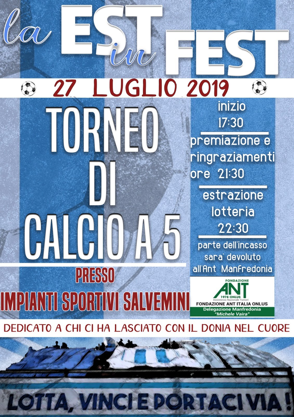 Il prossimo 27 Luglio presso gli impianti sportivi della Salvemini si terrà “Est in Fest”, il torneo di calcio a 5 “dedicato a chi ci ha lasciato con il Donia nel cuore“.