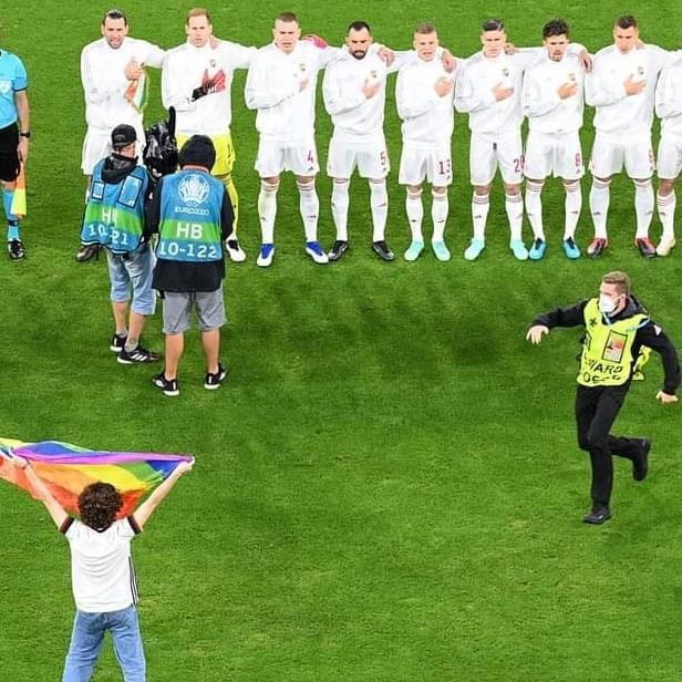 Irruzione pacifica in campo con un tifoso che mostra la bandiera arcobaleno davanti alle nazionali schierate prima del fischio d’inizio di Germania-Ungheria, durante l’inno magiaro. Un gesto iconico che ha subito fatto il giro del mondo ️‍