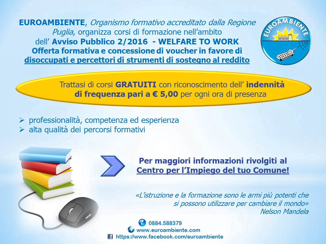 (Avviso n. 2/2016 Welfare to Work – http://www.sistema.puglia.it/SistemaPuglia/welfaretowork2016)