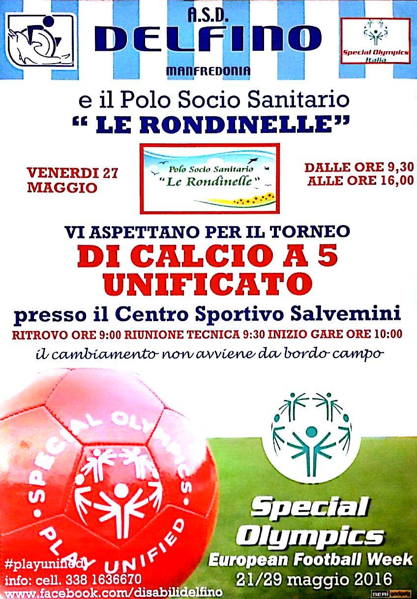 Promotori di questa splendida iniziativa, l’Associazione Sportiva per Disabili Delfino, il Polo Socio Sanitario “Le Rondinelle” e la Famiglia Salvemini, titolare dell’omonimo Centro Sportivo, che hanno aderito con entusiasmo ad una manifestazione che si svolge in contemporanea in tutta Italia e che ospita a Manfredonia le rappresentative Special Olympics di Puglia, oltre a due squadre locali composte dai “Delfini” e dalle “Rondinelle”.
