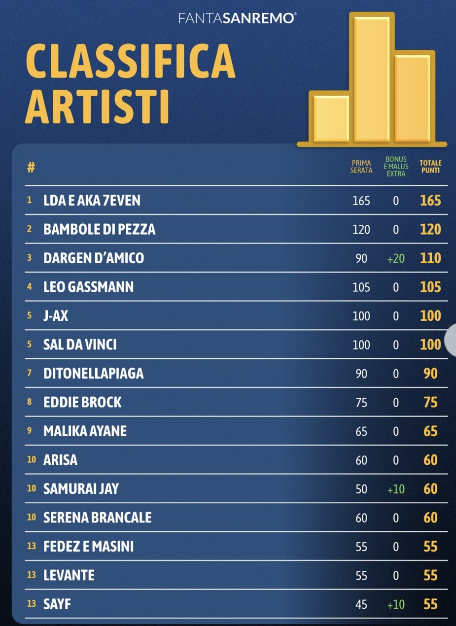 La classifica è ancora provvisoria e potrà cambiare nelle prossime serate, tra nuovi bonus, penalità e colpi di scena sul palco dell’Ariston.