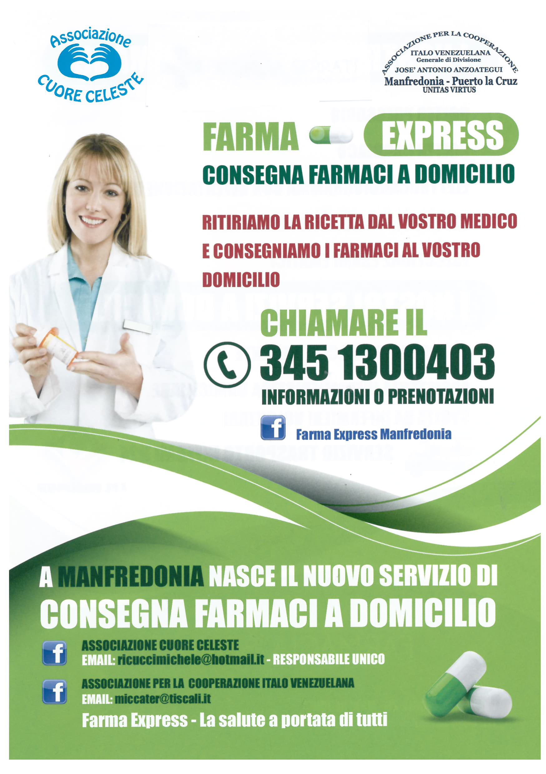 Pregevole iniziativa dell’ Associazione Cuore Celeste e dell’Associazione per la Cooperazione Italo Venezuelana, che annunciano il servizio di ritiro ricetta dal medico e consegna farmaci a domicilio A Manfredonia.