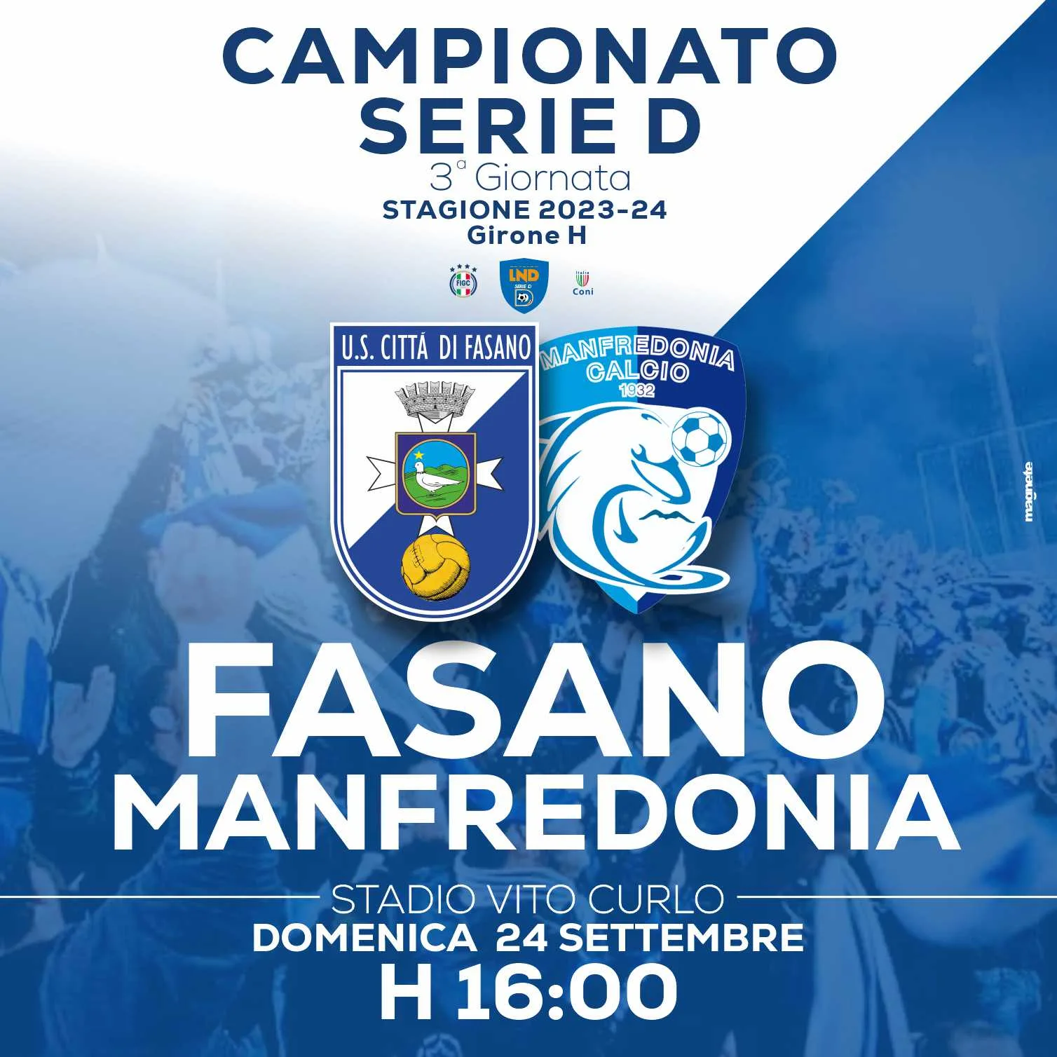Fasano-Manfredonia si giocherà alle ore 16 di domenica 24 settembre allo stadio Vito Curlo, quello della promozione in D del 21 maggio.