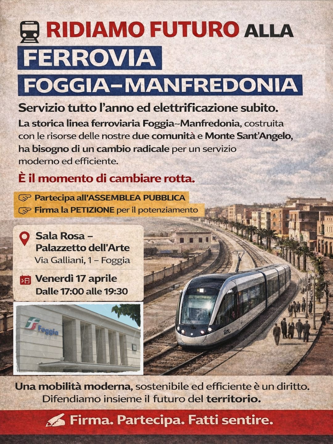 Assemblea pubblica aperta venerdì 17 aprile al Palazzetto dell’Arte: verrà presentata la petizione per sollecitare la trasformazione della linea realizzata tra il 1879 e il 1885 con i fondi delle Comunità di Foggia (51%), Manfredonia (34%) e Monte Sant’Angelo (15%) in una metropolitana di superficie elettrica, per una mobilità sostenibile con servizi cadenzati e tutto l’anno con possibile duplice utilizzo intermodale per passeggeri e merci.