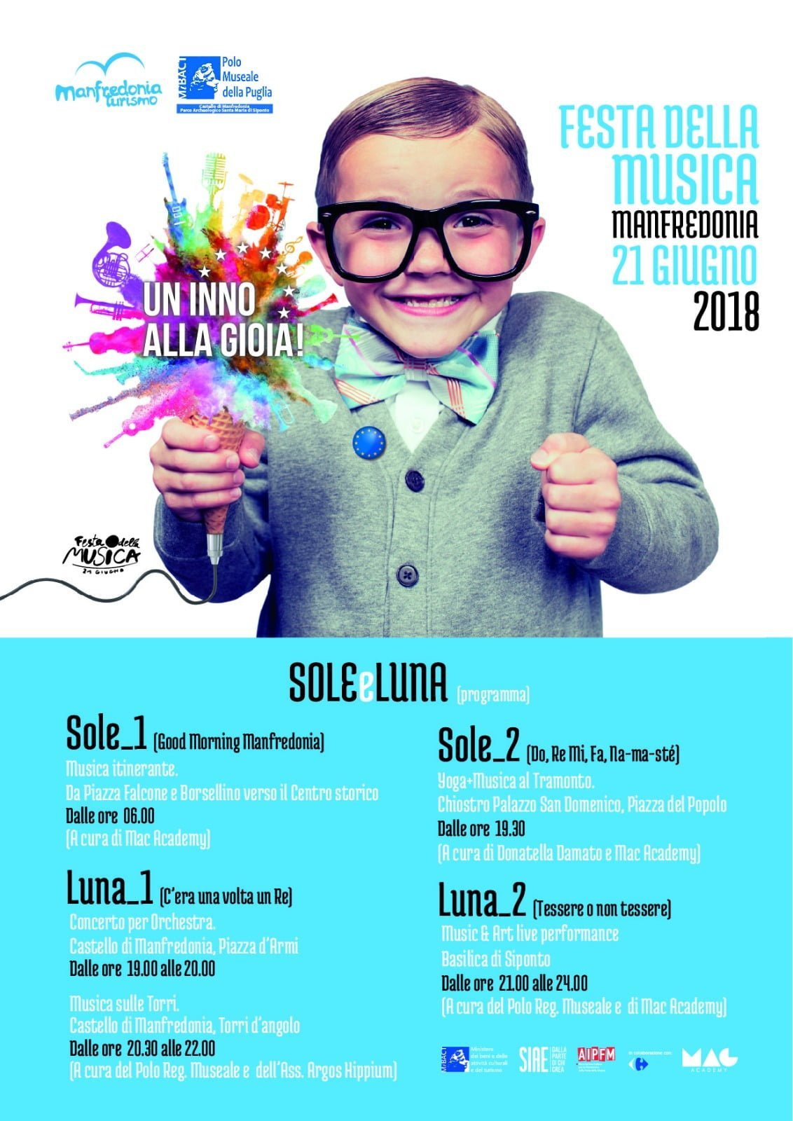 “GoodMorning Manfredonia”, “Do, Re Mi, Fa, Na-ma-sté”, “C’era una volta un Re”, “Tessere o non tessere”. Una prolungata e trascinante sinfonia, sotto il nome di “Sole e Luna”, dall’alba a notte fonda, quattro momenti, decine di artisti. E’ il programma della “Festa della Musica” di Manfredonia (coordinato dall’Agenzia del Turismo in sinergia con altre realtà locali) del 21 giugno, con eventi gratuiti e dislocati in tutta la città all’insegna della musica e dell’arte in tutte le sue sfaccettature per dare il benvenuto all’estate.