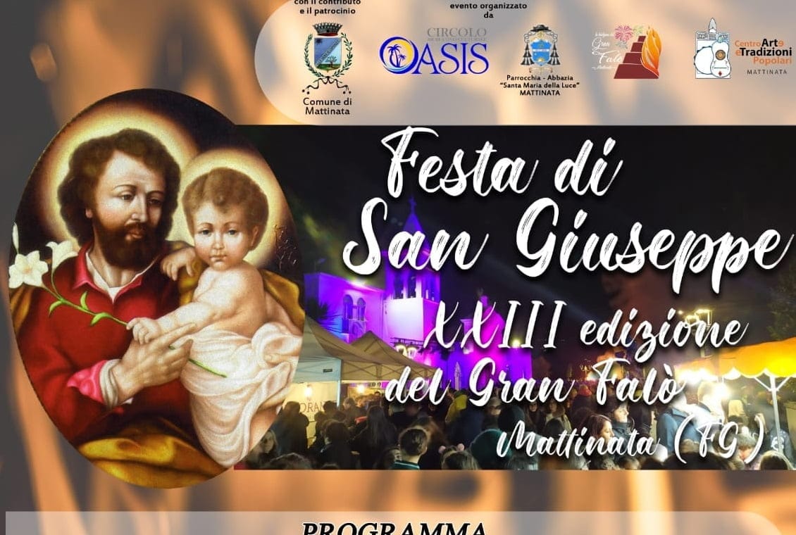 L’evento organizzato dal Circolo Oasis, con il supporto del Comune di Mattinata e la collaborazione della Parrocchia Santa Maria della Luce e del Centro Arte e Tradizioni Popolari, si svolgerà il 18 e il 19 marzo 2024 con un programma sia civile che religioso.