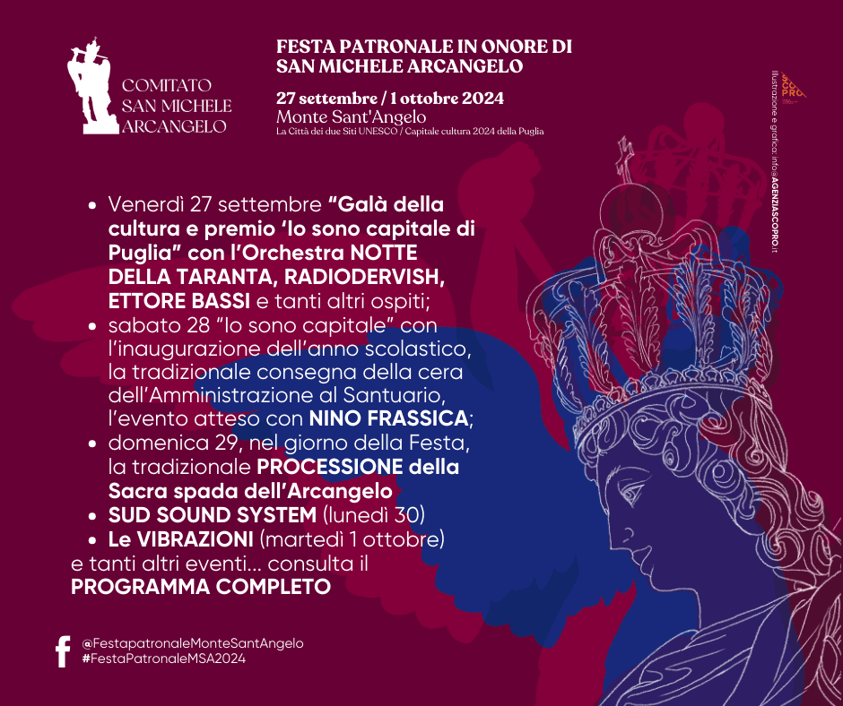 “Un programma pensato e dedicato a tutti in questo anno speciale di Monte Sant’Angelo Capitale della cultura in Puglia” – il commento del Sindaco Pierpaolo d’Arienzo e del presidente del Comitato, Antonio Renzulli.